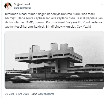 "Tercüman binası mimarî değeri nedeniyle Koruma Kurulu'nca tescil edilmişti. Daha sonra cephesi ilanlarla kaplanır oldu. Tescilli yapılara ilan vb. konulamaz. İSMD, durumu Koruma Kurulu'na yansıttı. Kurul nedense yapının tescil kararını kaldırdı. Şimdi binayı yıkmışlar. Çok Yazık!"