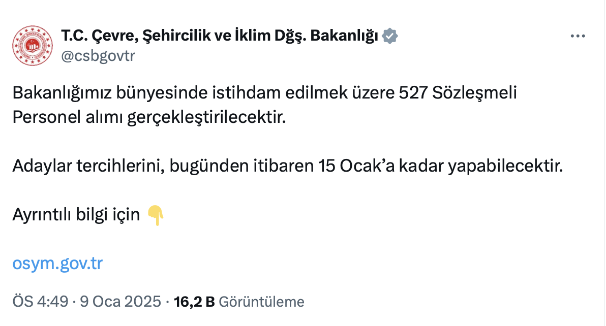 Çevre, Şehircilik ve İklim Değişikliği Bakanlığı’nın resmi sosyal medya hesabı https://x.com/csbgovtr üzerinden yapılan açıklamada, "Bakanlığımız bünyesinde istihdam edilmek üzere 527 sözleşmeli personel alımı gerçekleştirilecektir. Adaylar tercihlerini, bugünden itibaren 15 Ocak'a kadar yapabilecektir" ifadelerine yer verildi.