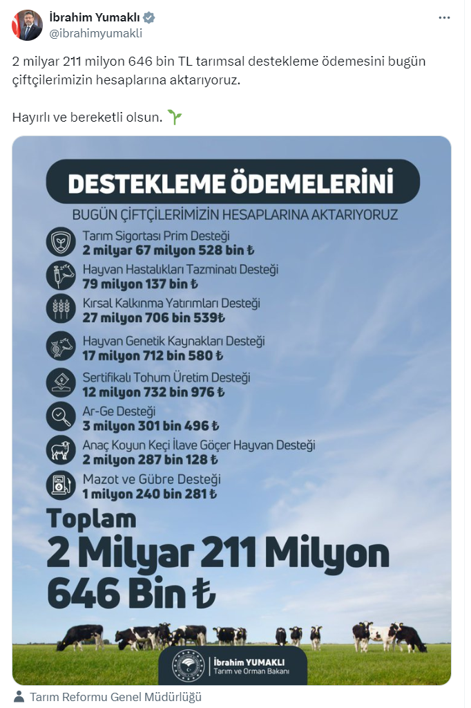 Tarım ve Orman Bakanı İbrahim Yumaklı, resmi sosyal medya hesabı üzerinden yaptığı paylaşımda 2 milyar 211 milyon 646 bin TL tutarındaki tarımsal destekleme ödemesinin hesaplara aktarılacağını duyurdu.