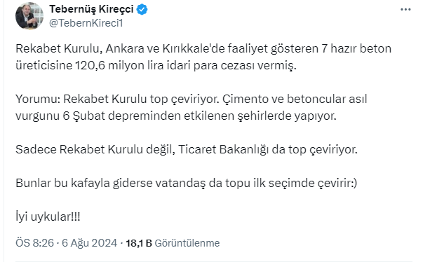 Rekabet Kurumu internet sitesinde yayımladığı açıklamasına göre; Ankara ve Kırıkkale'de faaliyet gösteren 12 hazır beton üreticisi hakkında yürütülen soruşturma sonuçlandı. Rekabet Kurulu, Ankara ve Kırıkkale'de faaliyet gösteren 7 hazır beton üreticisine toplamda 120,6 milyon lira idari para cezası uygulanmasına karar verdi. Bu kararın ardından Türkiye'nin 1 numaralı emlak ve konut editörü Tebernüş Kireçci çimento ve betoncuların asıl vurgunu 6 Şubat depreminden etkilenen şehirlerde yaptığına vurgu yaparak Rekabet Kurulu ve Ticaret Bakanlığı'nın top çevirdiğini açıkladı.