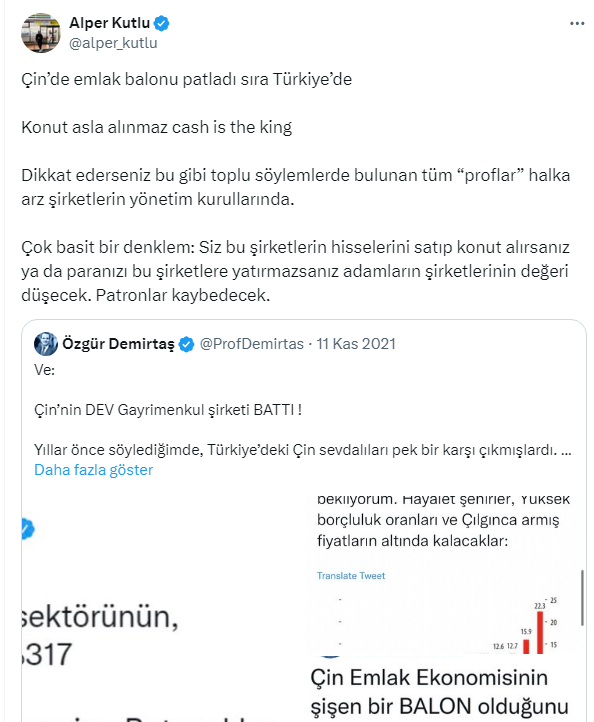 Bu paylaşımın alıntı yaparak kendi düşüncelerini ekleyen İnşaat doktoru kurucusu Alper Kutlu 'Çin’de emlak balonu patladı sıra Türkiye’de' diyerek asla konut alınmaması gerektiğine dikkat çekti. İşte Alper Kutlu'nun sosyal medya hesabı X'ten yaptığı o paylaşım...