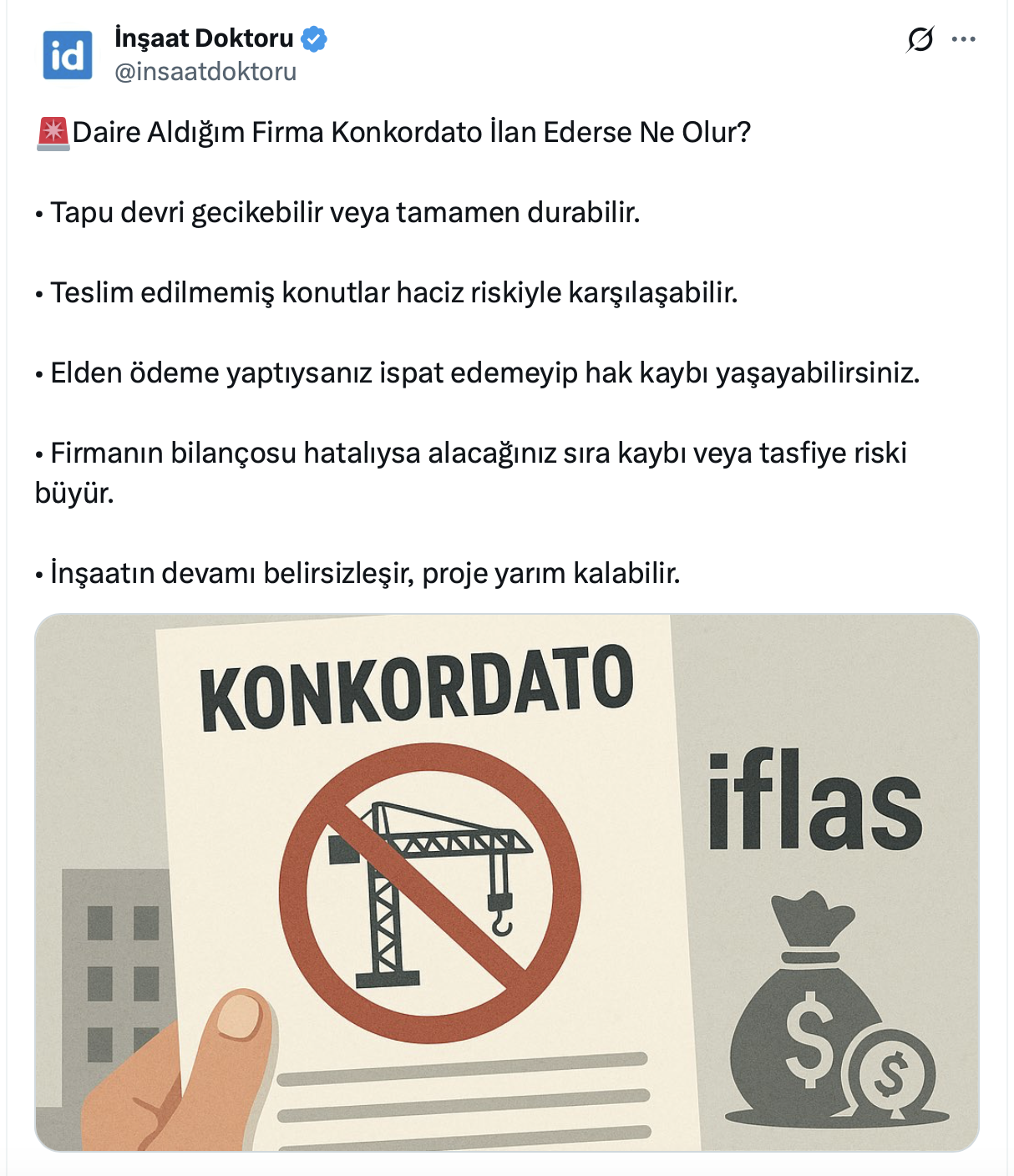 68,8 bin takipçili İnşaat Doktoru resmi sosyal medya hesabı üzerinden yaptığı paylaşımda “Daire aldığım firma konkordato ilan ederse ne olur?” Sorusuna yanıt verdi.
