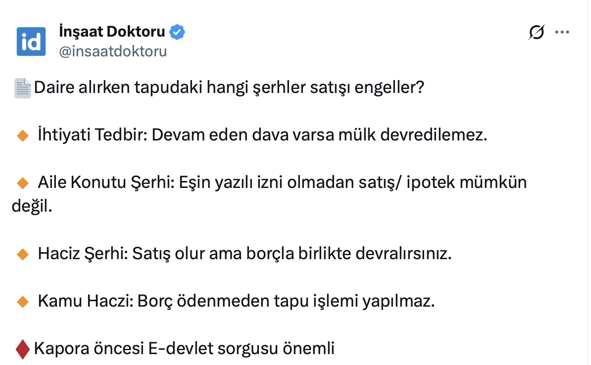 Konut, inşaat ve emlak sektörü ile ilgili yaptığı paylaşımlarla dikkat çeken 68,4 bin bin takipçili İnşaat Doktoru resmi X hesabı https://twitter.com/insaatdr üzerinden yaptığı paylaşımda daire alırken tapudaki hangi şerhlerin satışı engellediğini açıkladı.