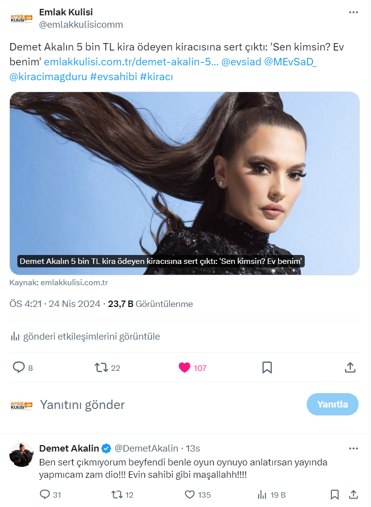 Resmi X hesabı https://twitter.com/DemetAkalin üzerindenTürkiye'nin ilk ve tek emlak haberleri sitesi Emlakkulisi.com'un paylaşımına yorum yapan ünlü şarkıcı "Ben sert çıkmıyorum beyefendi benimle oyun oynuyor, anlatırsan yayında yapmayacağım zam diyor!!! Evin sahibi gibi maşallahh!!!" ifadelerini kullandı.