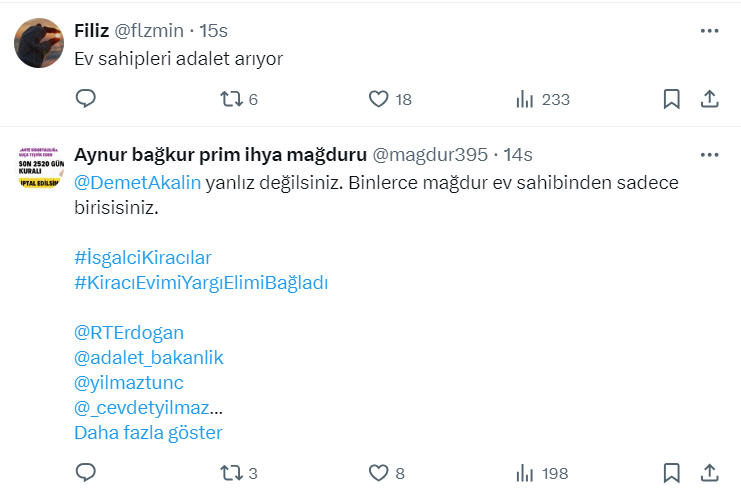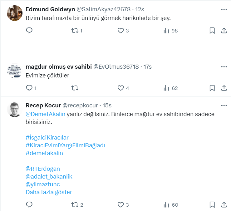 Mağdur ev sahipleri de yaptıkları yorumlarda Demet Akalın'a destek verirken, "Bizim tarafımızda bir ünlüyü görmek harikulade bir şey", "Yalnız değilsiniz. Binlerce mağdur ev sahibinden sadece birisisiniz." ifadelerini kullandı.