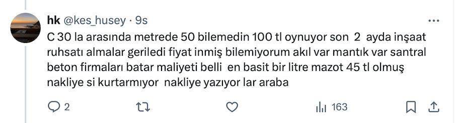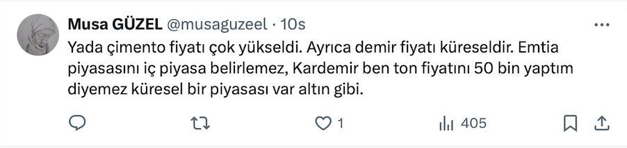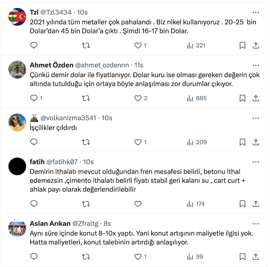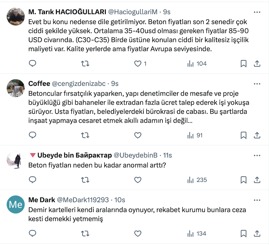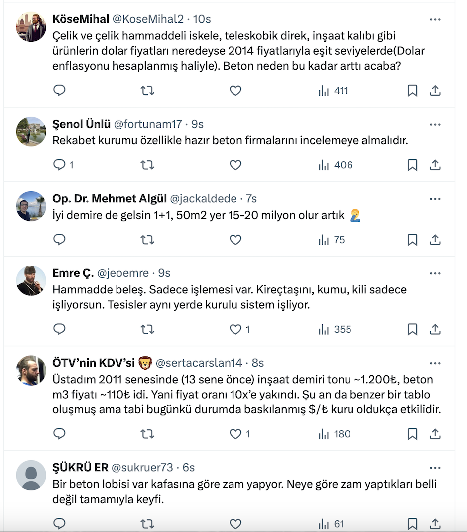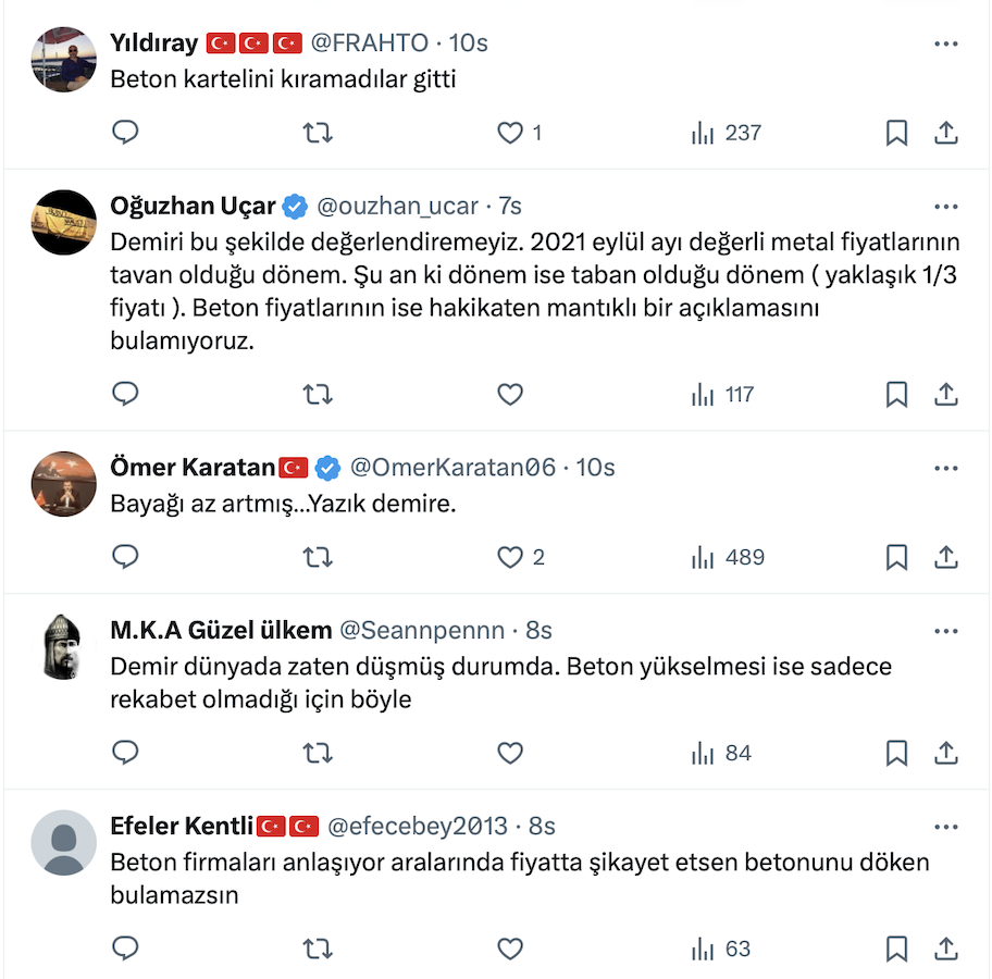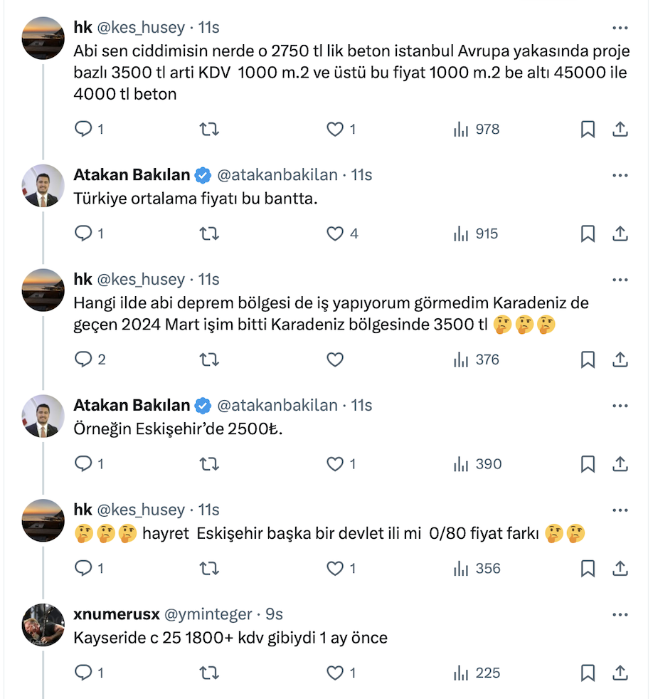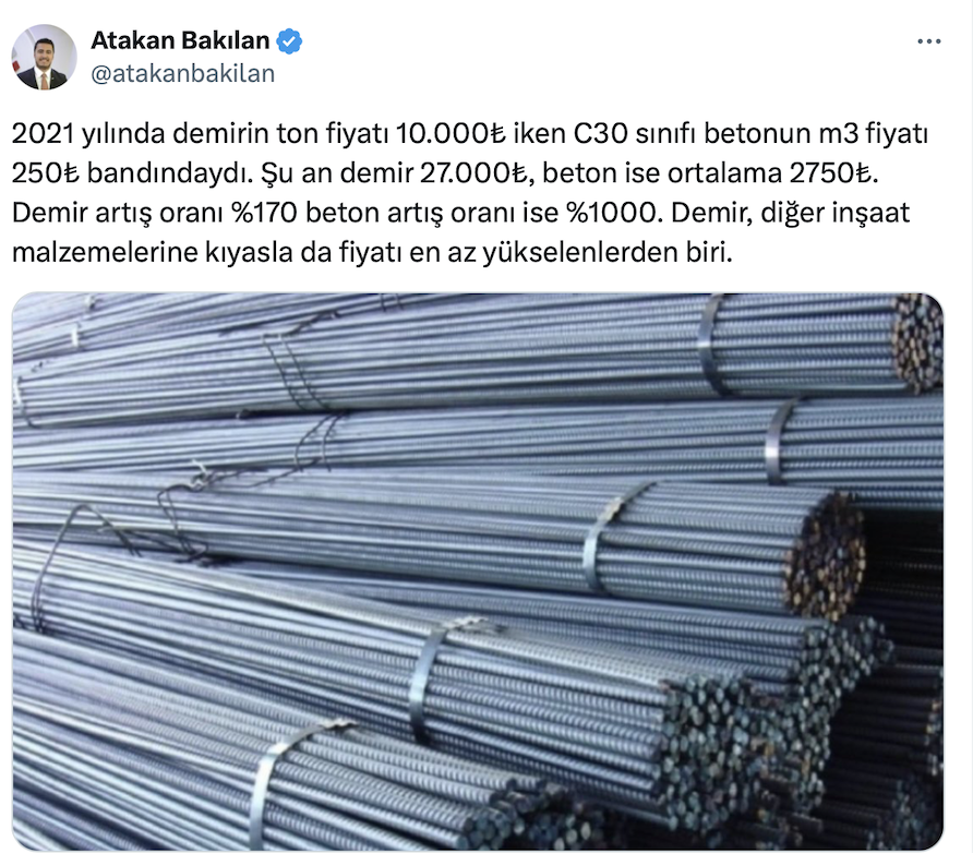 Atakan Bakılan yaptığı paylaşımda demir fiyatlarının 2021’den bu yana yüzde 170 artarken, beton fiyatlarının yüzde bin arttığını söyledi.