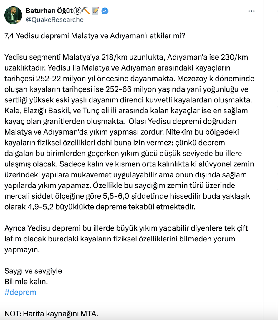 Deprem araştırmacısı Baturhan Öğüt yaptığı paylaşımda şu ifadelere yer verdi: