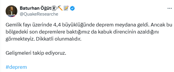Gemlik fayı üzerinde 4,4 büyüklüğünde deprem meydana geldi. Ancak bu bölgedeki son depremlere baktığımız da kabuk direncinin azaldığını görmekteyiz. Dikkatli olunmalıdır.