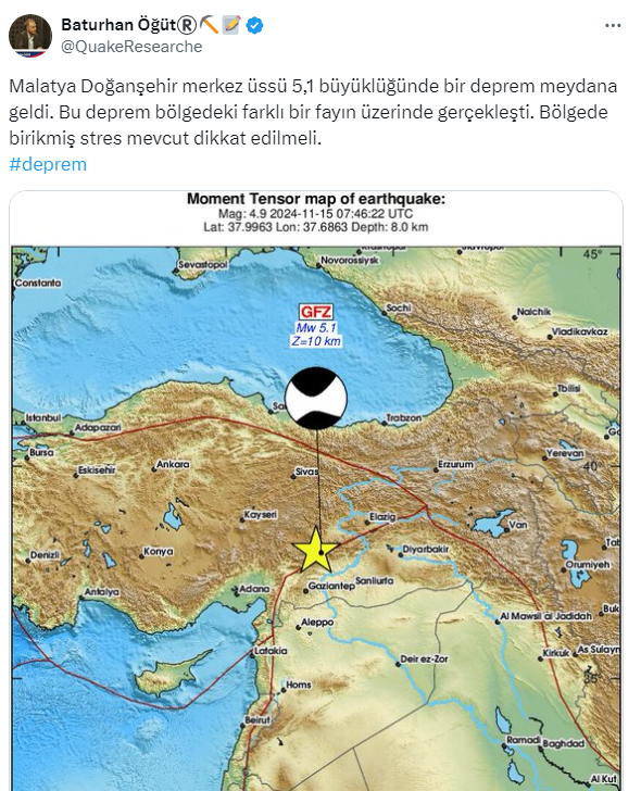 Malatya Doğanşehir merkez üssü 5,1 büyüklüğünde bir deprem meydana geldi. Bu deprem bölgedeki farklı bir fayın üzerinde gerçekleşti. Bölgede birikmiş stres mevcut dikkat edilmeli.