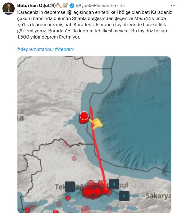 İşte Baturhan Öğüt'ün sosyal medya hesabı X'ten yaptığı o paylaşım: ''Karadeniz'in depremselliği açısından en tehlikeli bölge olan batı Karadeniz çukuru batısında bulunan Shabla bölgesinden geçen ve MS:544 yılında 7,5'lik deprem üretmiş batı Karadeniz Istıranca fayı üzerinde hareketlilik gözlemliyoruz. Burada 7,5'lik deprem tehlikesi mevcut. Bu fay düz hesap 1.500 yıldır deprem üretmiyor.''