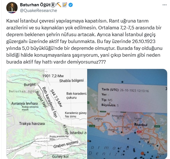 Öte yandan Baturhan Öğüt Kanal İstanbul projesi için de kritik açılamalar yaptı. Kanal İstanbul''un yapılaşmaya kapatılmasını söyleyen Öğüt, Kanal İstanbul'un fay üzerinde olduğunu ve '' Bu fay üzerinde 26.10.1923 yılında 5,0 büyüklüğü'nde bir depremde olmuştur.'' dedi.