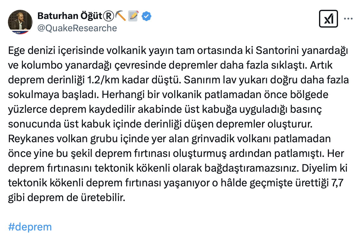 Baturhan Öğüt, paylaşımında Ege denizi içerisinde volkanik yayın tam ortasında ki Santorini yanardağı ve kolumbo yanardağı çevresinde depremler daha fazla sıklaştığını belirterek, “Diyelim ki tektonik kökenli deprem fırtınası yaşanıyor o hâlde geçmişte ürettiği 7,7 gibi deprem de üretebilir.” ifadelerini kullandı.