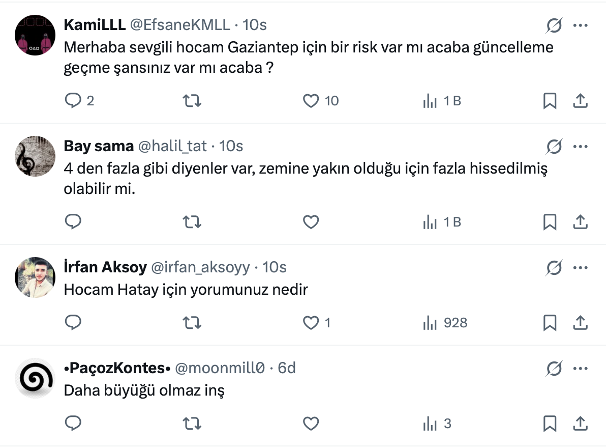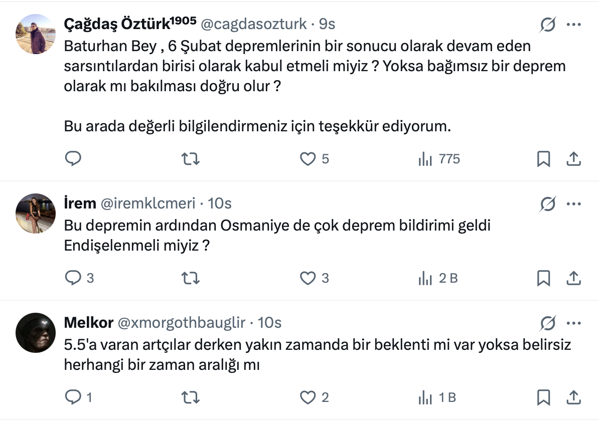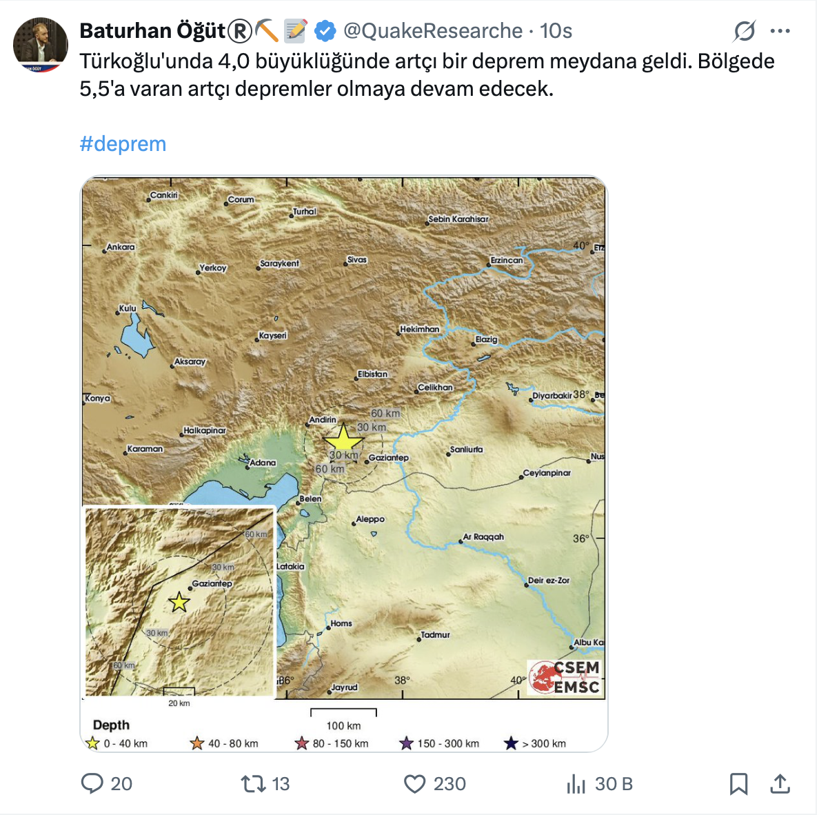 Deprem araştırmacısı Baturhan Öğüt yaptığı paylaşımda “Türkoğlu'unda 4,0 büyüklüğünde artçı bir deprem meydana geldi. Bölgede 5,5'a varan artçı depremler olmaya devam edecek.” Ifadelerini kullandı.