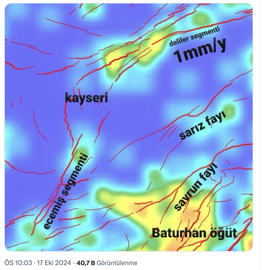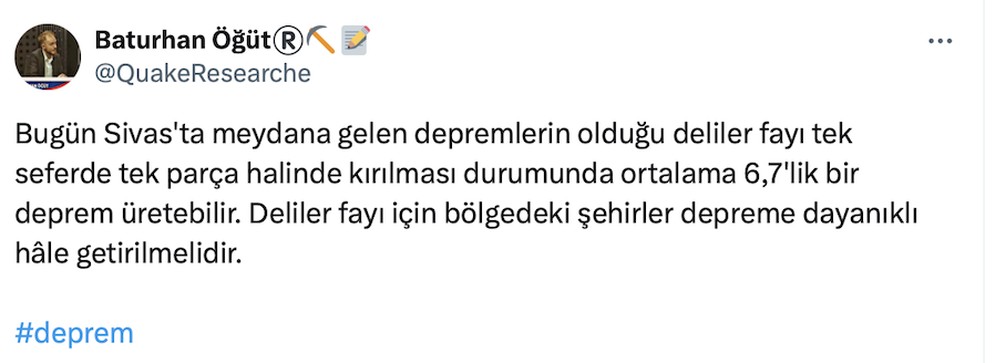 Baturhan Öğüt, yaptığı paylaşımda Sivas'ta meydana gelen depremlerin olduğu deliler fayının tek seferde tek parça halinde kırılması durumunda ortalama 6,7'lik bir deprem üretebileceğini söyledi.