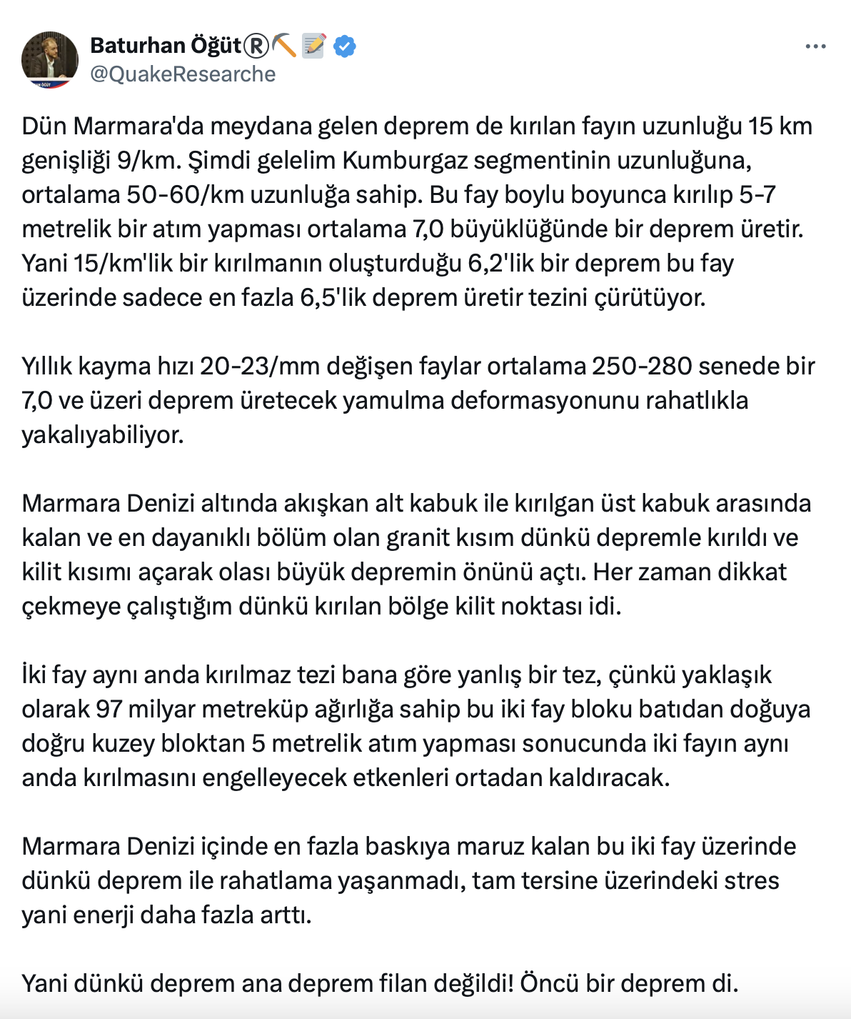 Yaptığı isabetli deprem tahminleriyle dikkat çeken Deprem Araştırmacısı Baturhan Öğüt de resmi sosyal medya hesabı https://x.com/QuakeResearche üzerinden yaptığı paylaşımda Kumburgaz segmentinin 50-60/km uzunluğa sahip olduğunu belirterek, “Bu fay boylu boyunca kırılıp 5-7 metrelik bir atım yapması ortalama 7,0 büyüklüğünde bir deprem üretir.” Dedi.