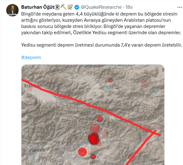 Bingöl'de peş peşe meydana gelen depremlerden sonra, Deprem araştırmacısı Baturhan Öğüt'ten açıklama geldi. Öğüt sosyal medya hesabı X'ten ''Yedisu segmenti deprem üretmesi durumunda 7,4'e varan deprem üretebilir.'' diyerek uyarıda bulundu.