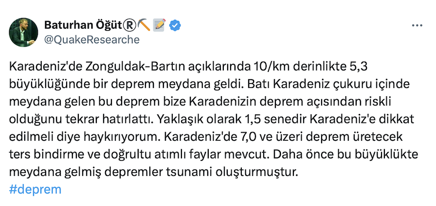 Deprem araştırmacısı Baturhan Öğüt, resmi sosyal medya hesabı üzerinden yaptığı paylaşımda yaklaşık olarak 1,5 senedir Karadeniz'e dikkat edilmeli diye haykırdığını belirterek, Karadeniz'de 7,0 ve üzeri deprem üretecek ters bindirme ve doğrultu atımlı fayların mevcut olduğunu söyledi.
