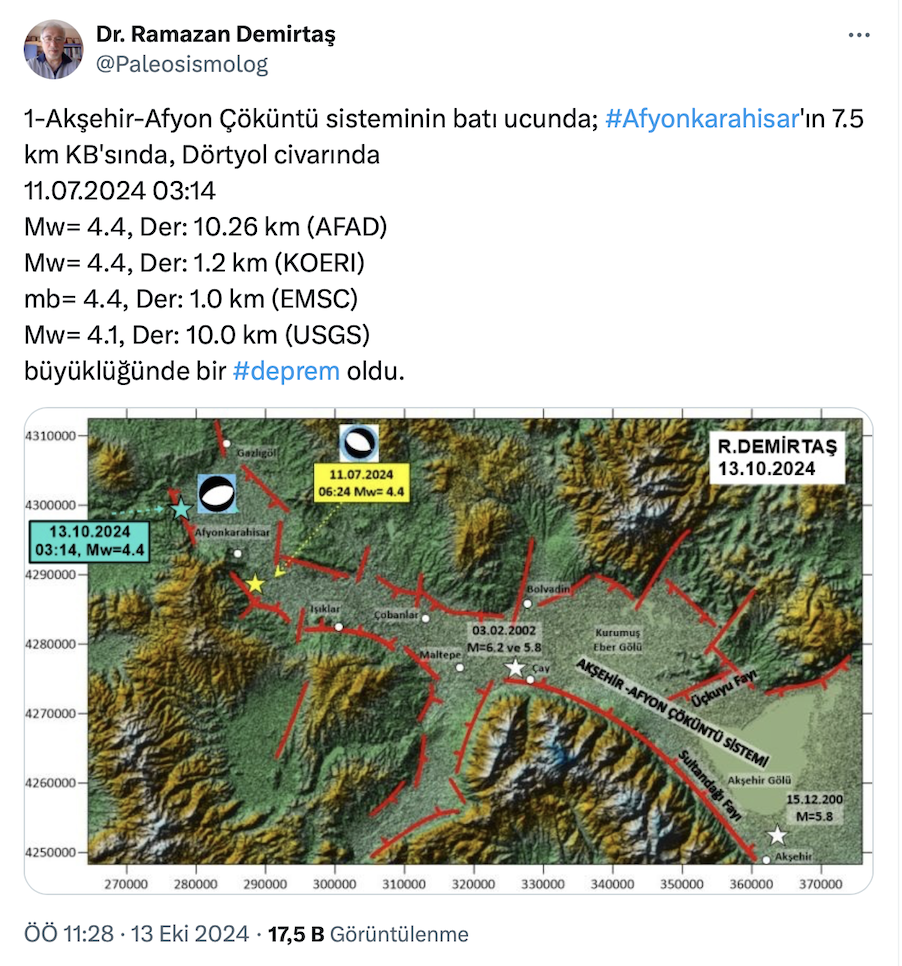 Afyonkarahisar’da meydana gelen 4,4 şiddetindeki depremde sonra Deprem Bilimci Dr. Ramazan Demirtaş’tan konu ile ilgili çok önemli açıklamalar geldi. İşte o açıklamalar…