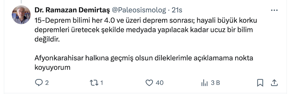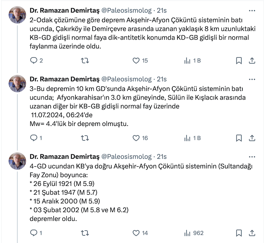 Deprem Bilimci Dr. Ramazan Demirtaş’ın paylaşımı şu şekilde:
