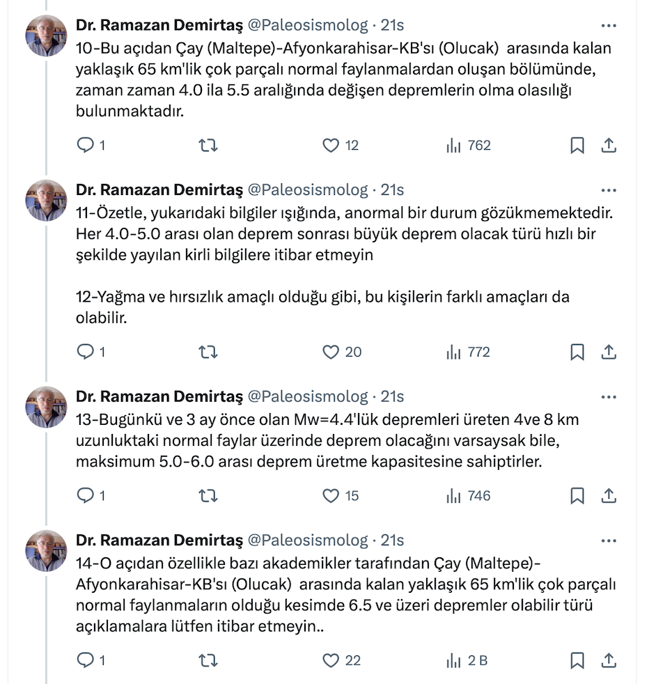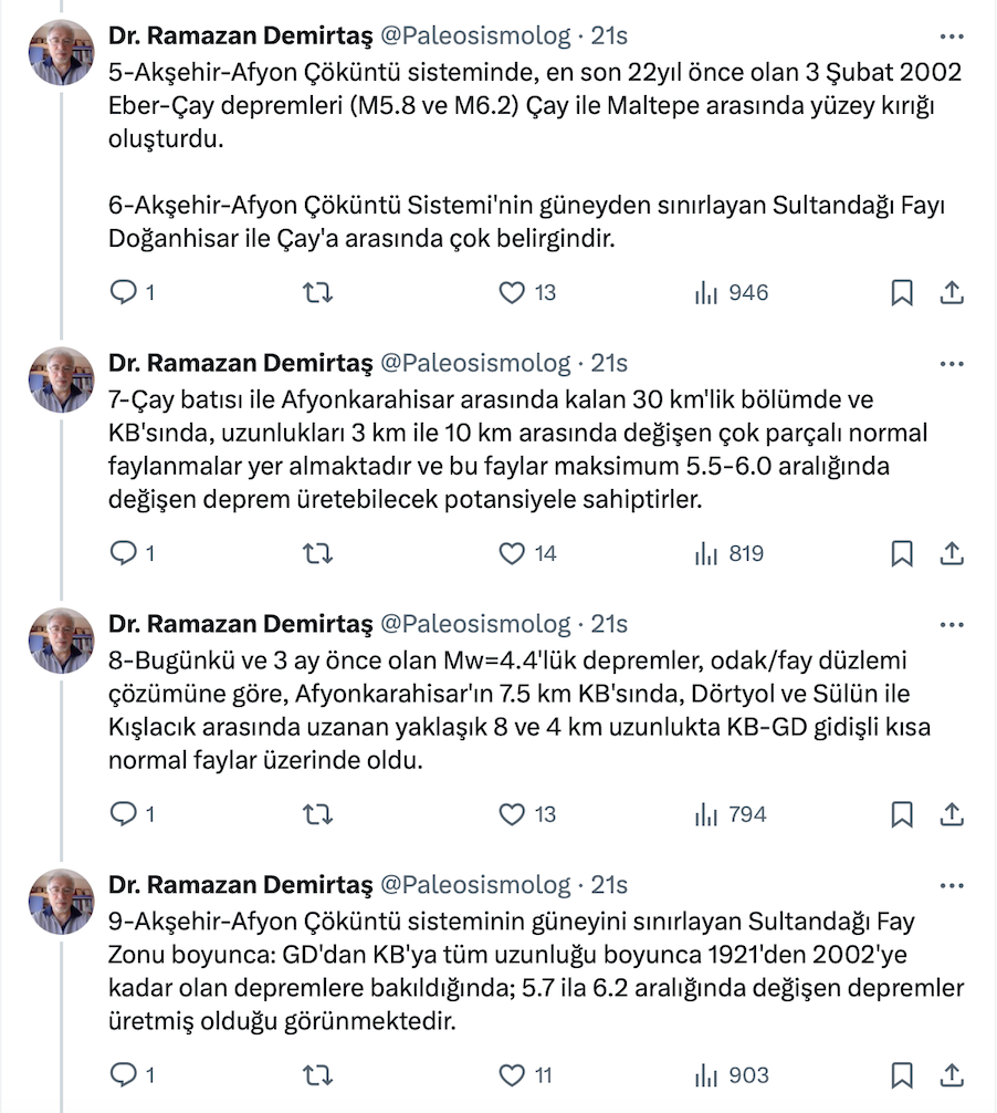 Resmi sosyal medya hesabı https://x.com/Paleosismolog üzerinden bir flood yayınlayan Dr. Ramazan Demirtaş Çay batısı ile Afyonkarahisar arasında kalan 30 kilometrelik bölümde ve KB'sında, uzunlukları 3 kilometre ile 10 kilometre arasında değişen çok parçalı normal faylanmalar yer aldığını ve bu faylar maksimum 5.5-6.0 aralığında değişen deprem üretebilecek potansiyele sahip olduğunu belirtti.