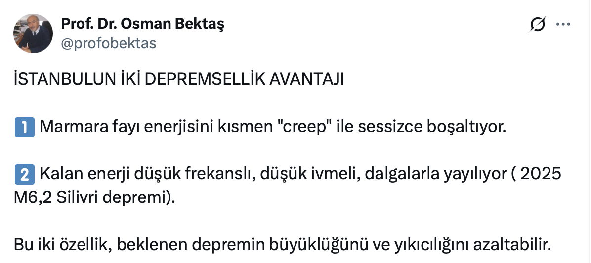 Deprem bilimci Prof. Dr. Osman Bektaş resmi sosyal medya hesabı https://x.com/profobektas üzerinden yaptığı paylaşımda İstanbul’un iki depremsellik avantajını açıkladı.