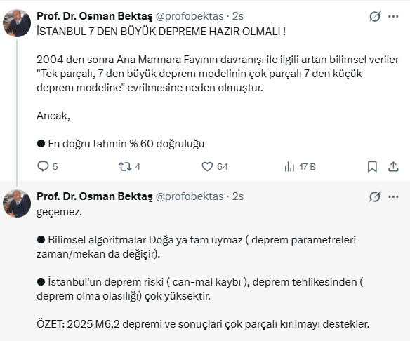 Deprem bilimci Prof. Dr. Osman Bektaş, sosyal medya hesbabı X'ten İstanbul için kritik açıklamalarda bulundu. Bektaş, İstanbul'un 7'den büyük depreme hazır olmasını söyleyerek uyarıyor.
