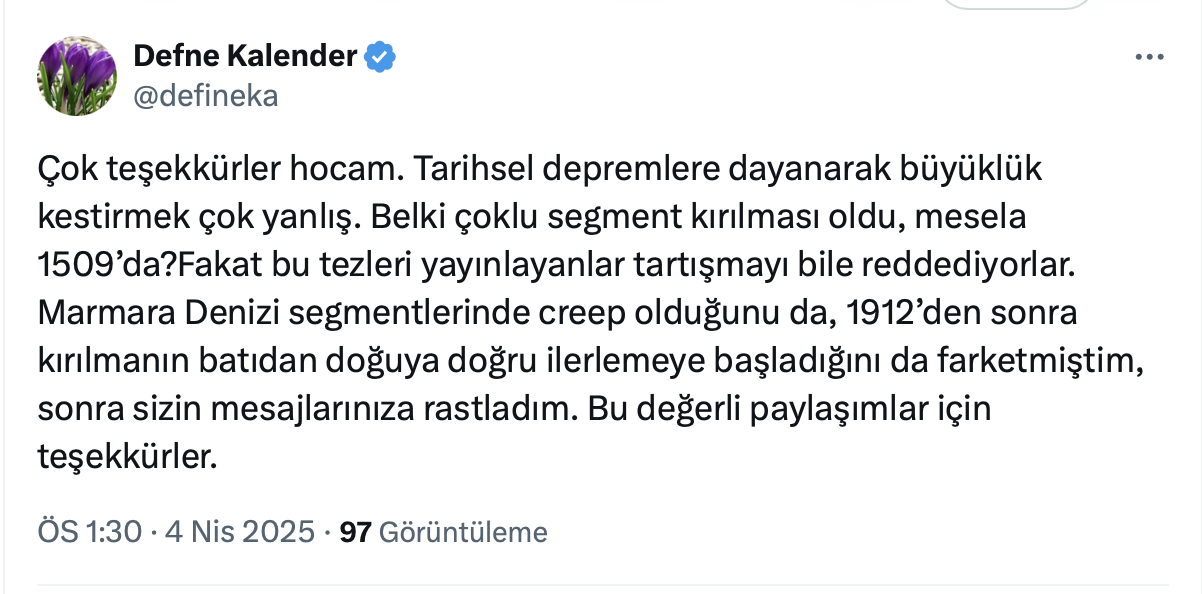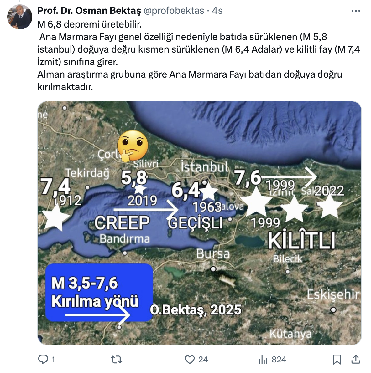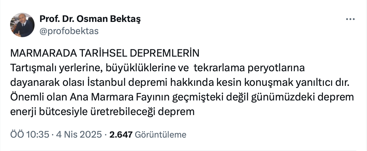 Deprem bilimci Prof. Dr. Osman Bektaş, resmi sosyal medya hesabı https://x.com/profobektas üzerinden yaptığı paylaşımda “Marmara’da tarihsel depremlerin tartışmalı yerlerine, büyüklüklerine ve tekrarlama peryotlarına dayanarak olası İstanbul depremi hakkında kesin konuşmak yanıltıcıdır.” dedi.