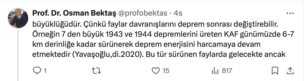 Deprem bilimci Prof. Dr. Osman Bektaş’ın paylaşımı şu şekilde: