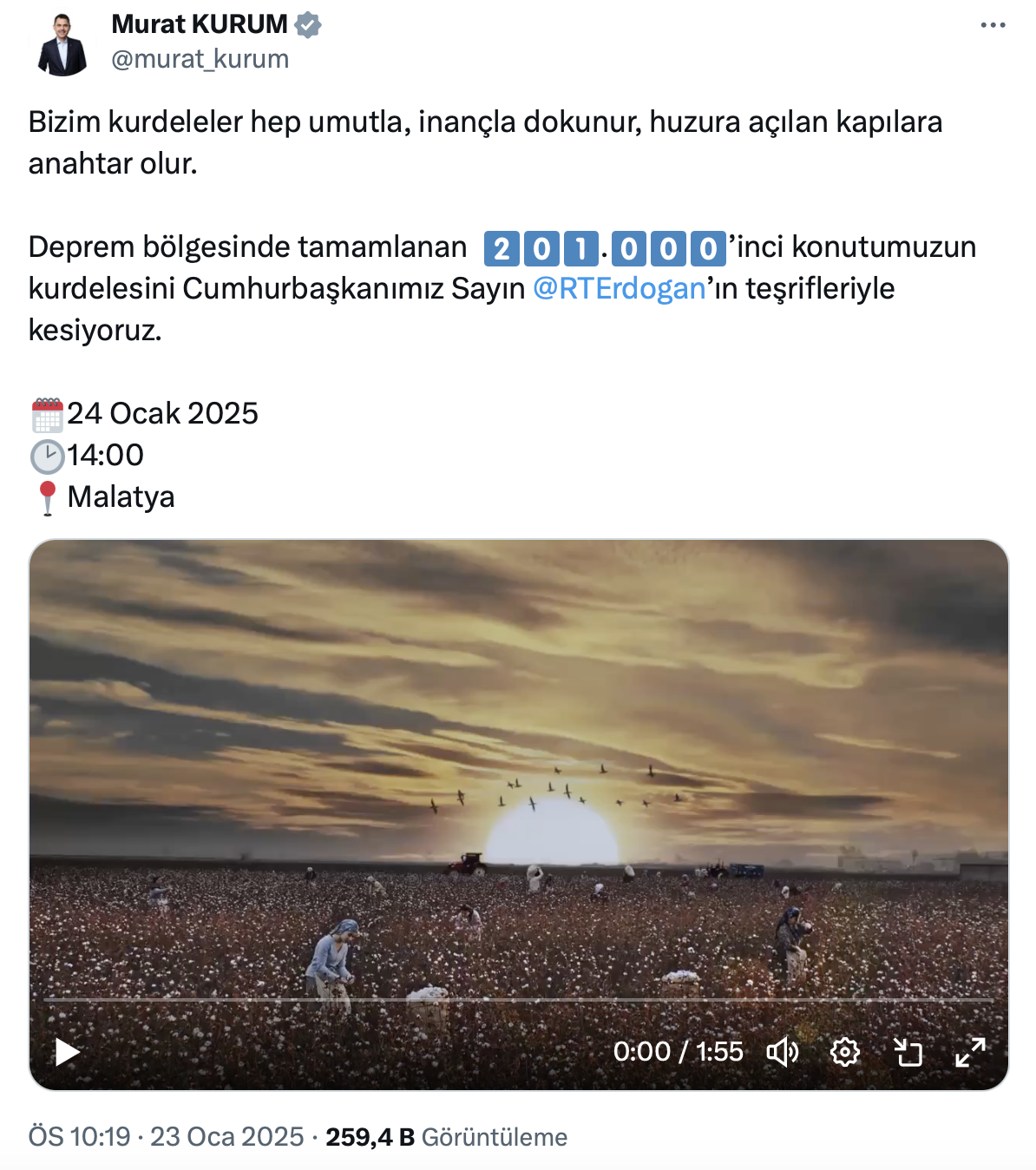 Sosyal medya hesabı üzerinden tanıtım filmini paylaşan Çevre, Şehircilik ve İklim Değişikliği Bakanı Murat Kurum, "Bizim kurdeleler hep umutla, inançla dokunur, huzura açılan kapılara anahtar olur. Deprem bölgesinde tamamlanan 201 bininci konutumuzun kurdelesini Cumhurbaşkanımız Sayın Recep Tayyip Erdoğan'ın teşrifleriyle kesiyoruz" ifadelerini kullandı.