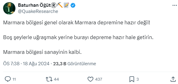Baturhan Öğüt, sosyal meyda hesabı X'ten yaptığı açıklamada Marmara depremi konusunda uyarılarda bulundu. İşte Öğüt'ün o açıklaması ve gelen yorumlar...