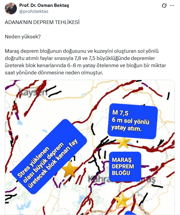 Deprem uzmanı Prof. Dr. Osman Bektaş, sosyal medya hesabından Adana'nın deprem tehlikesi altında olduğunu nedenleriyle açıkladı.