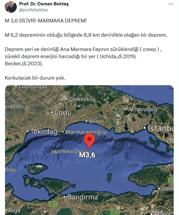 Deprem uzmanı Prof. Dr. Osman Bektaş dün Silivri'de meydana gelen depremle ilgili değerlendirmelerde bulundu. Bektaş, 'korkulacak bir durum yok' diyerek güzel haberi açıkladı.