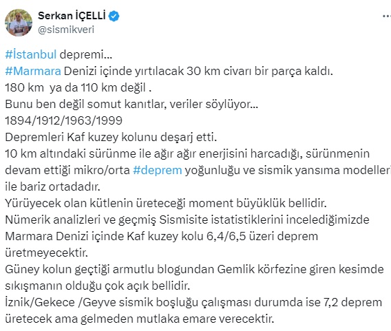 Deprem uzmanı Serkan İçelli sosyal medya hesabı X'ten olası İstanbul depremi için önemli açıklamalarda bulundu. İşte İçerli'nin o paylaşımı...