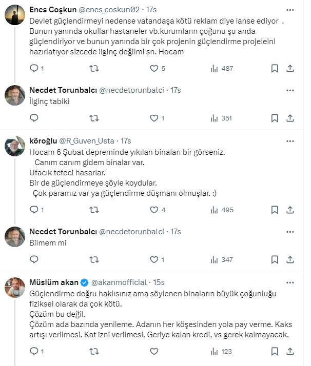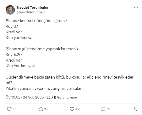 Prof. Dr. İnş. Yük. Müh.Necdet Torunbalcı sosyal medya hesabından vatandaşların kentsel dönüşüme yöneldiğini söyleyerek, kentsel dönüşüm ve güçlendirme çalışmaları ile ilgili hesaplamalar yaptı.