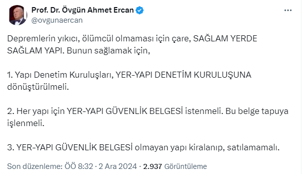 Soyal medya hesabı X'ten açıklama yapan Prof. Dr. Övgün Ahmet Ercan, 3 madede açıkladı. İşte ayrıntılar...