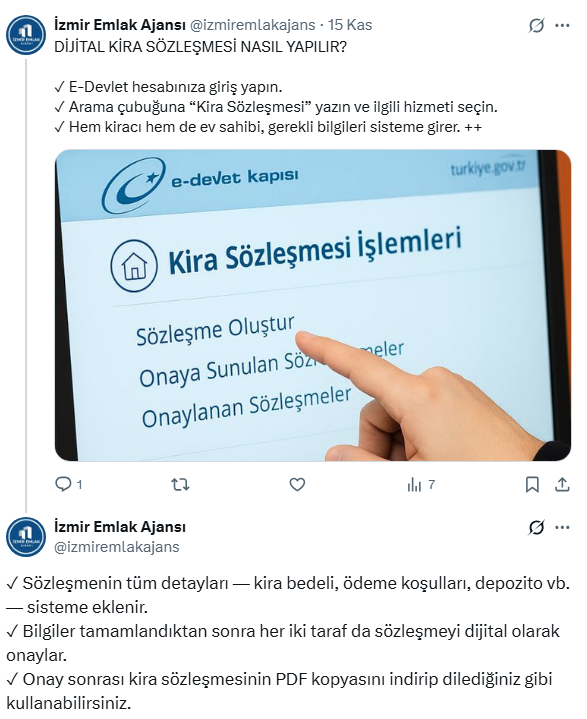 Bu yeni dönemde artık yetki belgesi bulunan emlak danışmanları ve yetkilendirilmiş kişiler de kira sözleşmesi hazırlayabiliyor. Peki dijital kira sözleşmesi nasıl yapılır? İzmir Emlak Ajansı sosyal medya hesabından tek tek açıkladı.