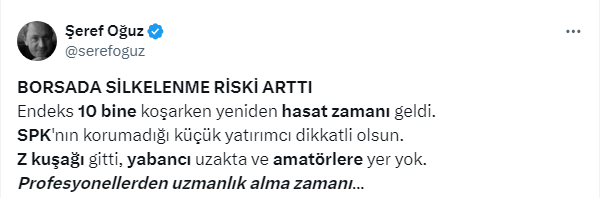 Dr. Şeref Oğuz X sosyal medya https://twitter.com/serefoguz X sosyal medya hesabı üzerinden ekonomim.com’a borsa ile ilgili yaptığı değerlendirmeyi paylaştı: