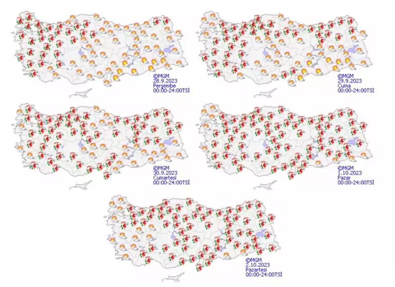 "Marmara Bölgesi'nde 28 Eylül 2023 tarihinde gök gürültülü sağanak yağışların sabah saatlerinden itibaren Tekirdağ ve Kırklareli çevreleri ile İstanbul'un batı bölgeleri ve Boğaz çevresinde, öğle saatlerinden itibaren ise Edirne ve Çanakkale çevrelerinde yerel olarak kuvvetli olabileceği tahmin edilmektedir. Bu nedenle ani sel, su baskını, yıldırım, yerel dolu yağışı, ani kuvvetli rüzgar ve kısa süreli fırtına gibi olumsuzluklara karşı dikkatli ve tedbirli olunmalıdır."