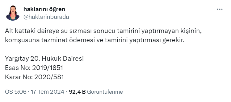 407,3 bin takipçili Haklarını öğren isimli X hesabı yaptığı paylaşımda alt kattaki daireye su sızması sonucu tamirini yaptırmayan kişinin, komşusuna tazminat ödemesi ve tamirini yaptırması gerektiğini belirtti.