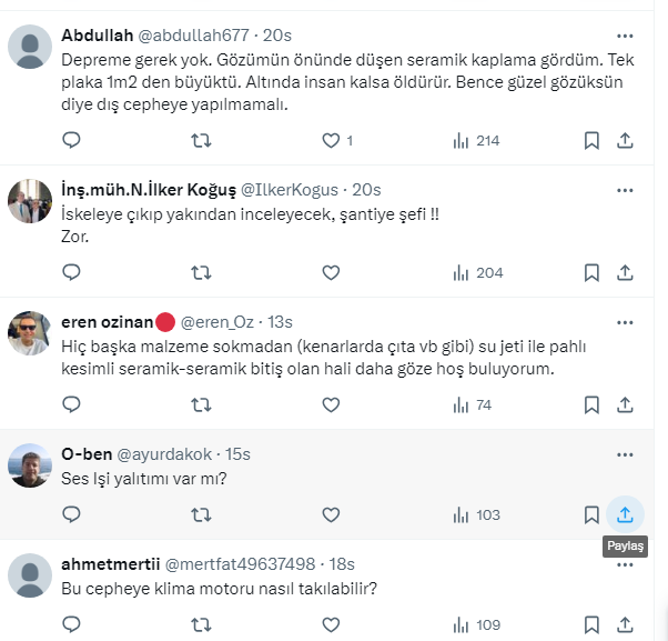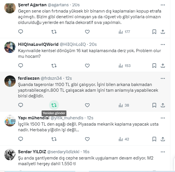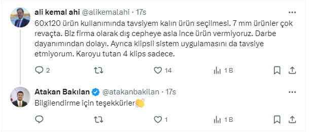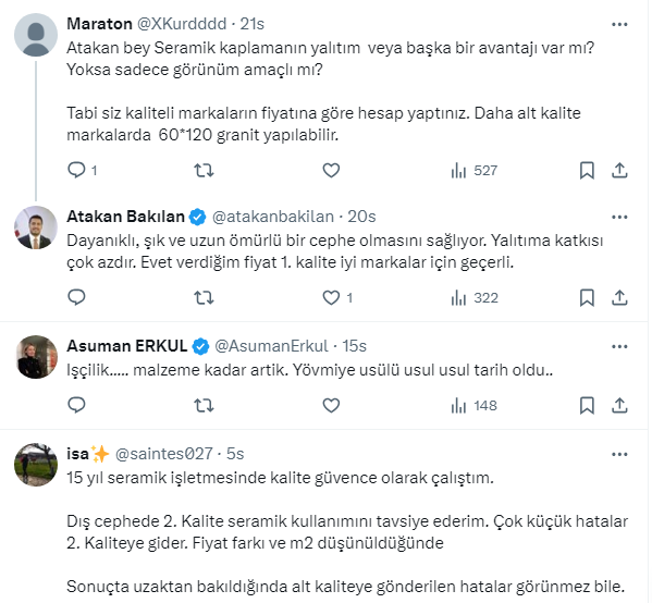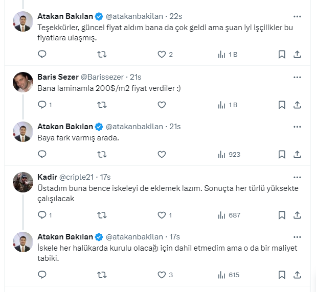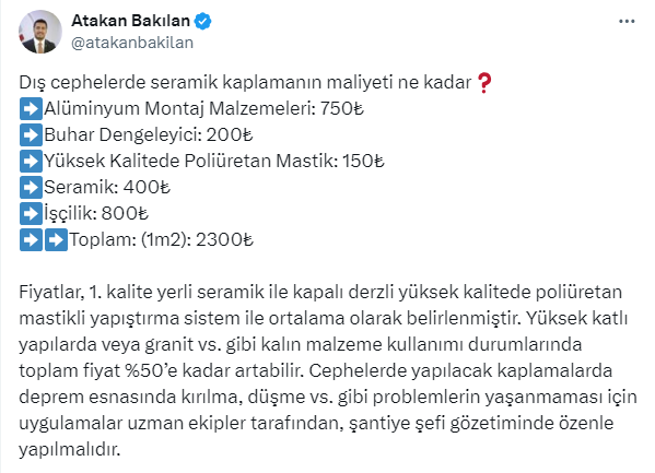 Atakan Bakılan https://x.com/atakanbakilan X sosyal medya hesabından yaptığı paylaşımda dış cephe seramik kaplamasının bedelini kalem kalem çıkardı. Bakılan’ın hesabı şöyle: