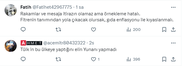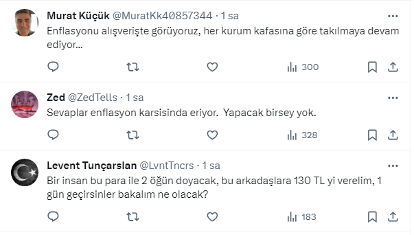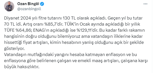 Bingöl, “Diyanet 2024 yılı fitre tutarını 130 TL olarak açıkladı. Geçen yıl bu tutar 70 TL idi. Artış oranı %85,7'dir. TÜİK'in Ocak ayında açıkladığı bir yıllık TÜFE %64,86; ENAG'ın açıkladığı ise %129,11'dir. Bu kadar farklı rakamın hangisinin doğru olduğunu bilemiyoruz ama vatandaşın iliklerine kadar hissettiği fiyat artışları, kimin hesabının yanlış olduğunu açık bir şekilde gösteriyor. Vatandaşın mutfağındaki yangını hesaba katmayan enflasyon ve bu enflasyona göre belirlenen çalışan ve emekli maaş artışları, çalışana karşı büyük haksızlıktır” dedi. Vatandaş Ozan’ın paylaşımını cevapsız bırakmadı.