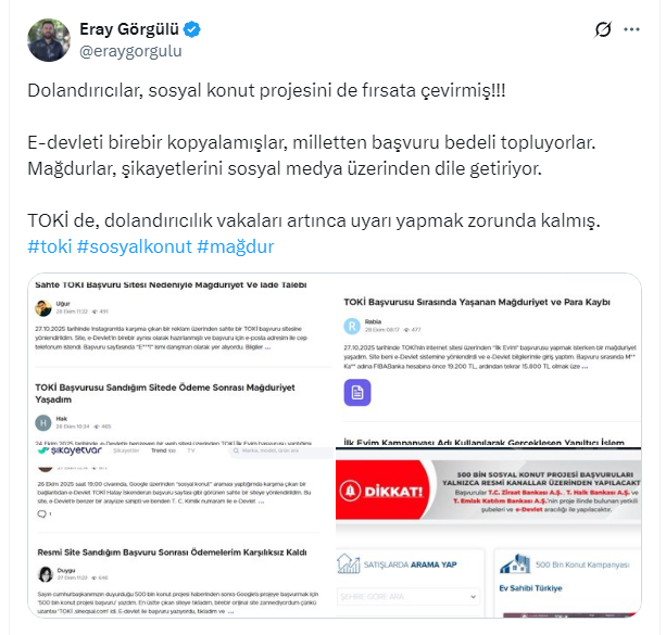 Gazeteci Eray Görgülü sosyal medya hesabından dolandırıcıların e devleti kopyaladığını söyeyerek, vatandaşları dikkatleri olmaları konusunda uyarıyor. İşte Eray Görgülü'nün sosyal medya hesabı X'ten yaptığı o paylaşım...