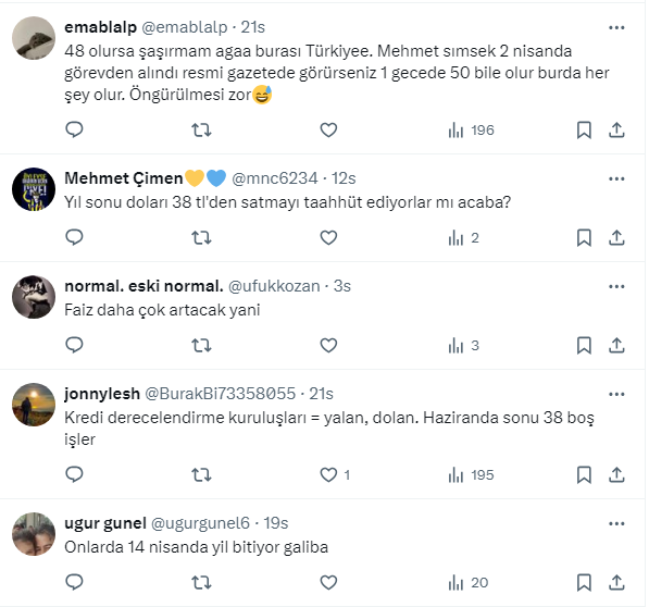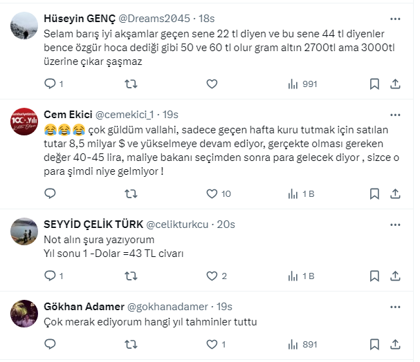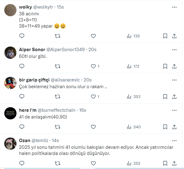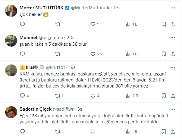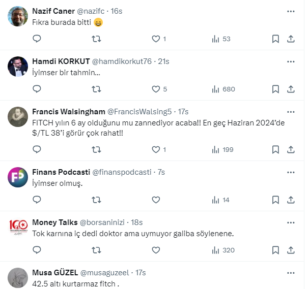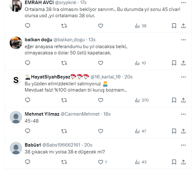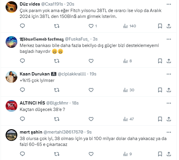 Dolar kuru bugün 32 TL’yi aşarken, Gazeteci Barış Esen https://twitter.com/barisesen X sosyal medya hesabından yaptığı paylaşımda Fitch’in 2024 dolar kuru tahminini paylaştı: “Fitch, Dolar/TL’nin yıl sonu 38 olmasını bekliyor” dedi. Paylaşıma yorum yağdıran takipçileri bunun bir hayal olduğunu, gerçekleşmesi için politika faizinin yükseltilmesi gerektiği söyledi.
