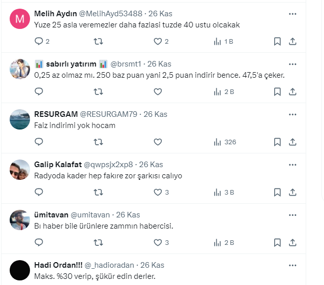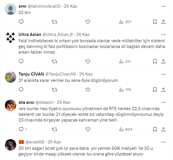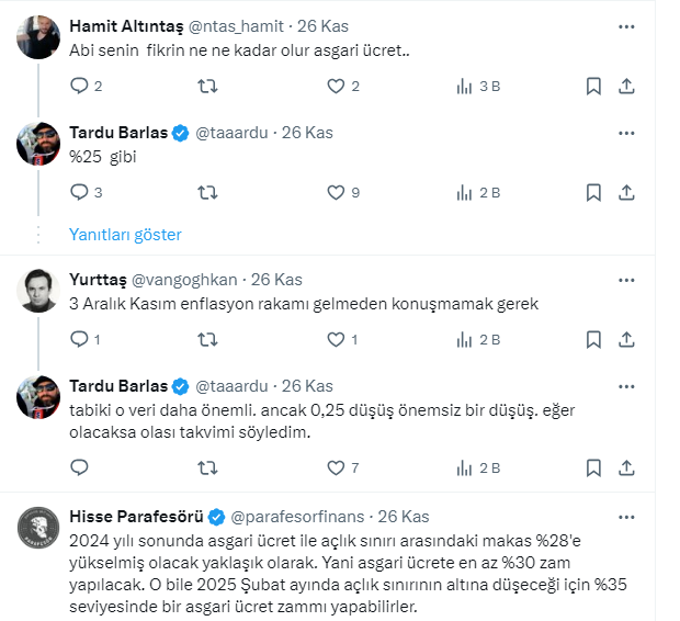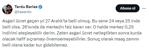 “Asgari ücret geçen yıl 27 Aralık'ta belli olmuş. Bu sene 24 veya 25 inde belli olsa. 26'sında da Merkezin faiz kararı var. O halde Merkez 0,25 indirimi ateşleyebilir derim. Zaten asgari ücret netleştikten sonra kurda olacak hafif sıçramayı önemsemeyebilirler. Sonuç olarak maaş zammı belli olana kadar kur gidebilemez.”