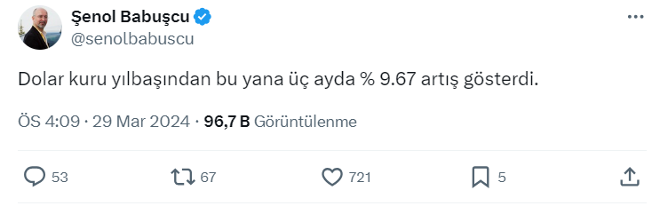 Ziraat Bankası Eski Genel Müdür Yardımcısı, Ekonomist Şenol Babuşçu resmi sosyal medya hesabı https://twitter.com/senolbabuscu yaptığı paylaşımda dolar kurunun yılbaşından bu yana üç ayda yüzde 9.67 artış gösterdiğini belirtti.