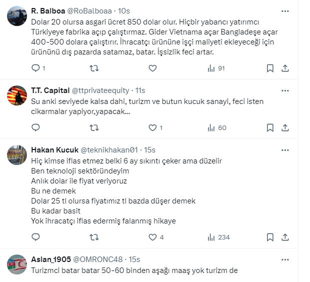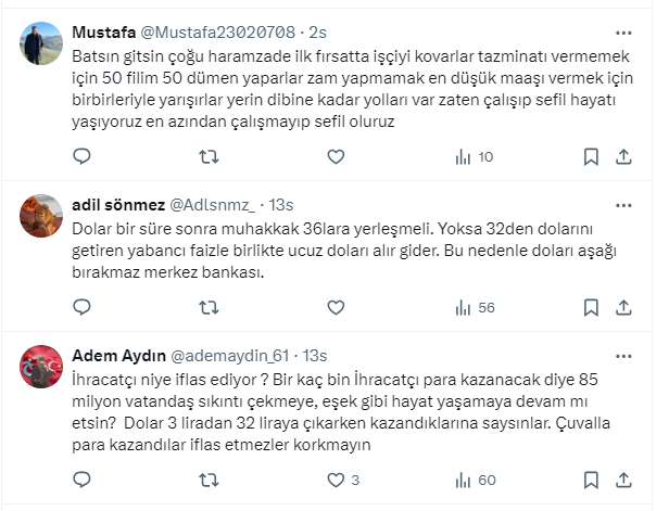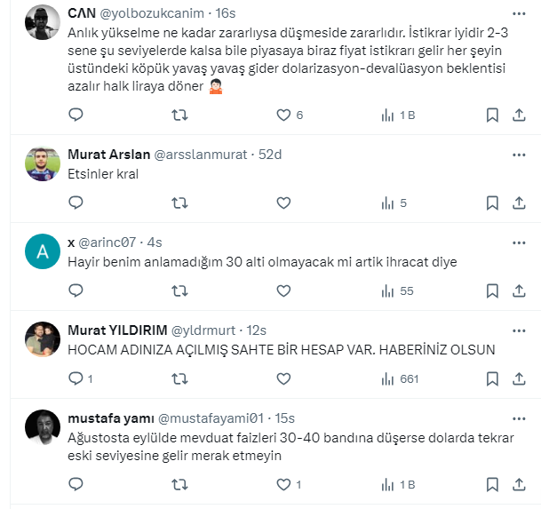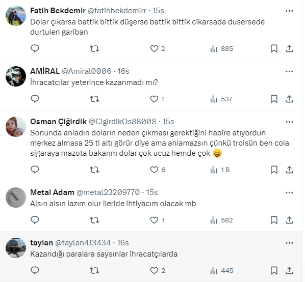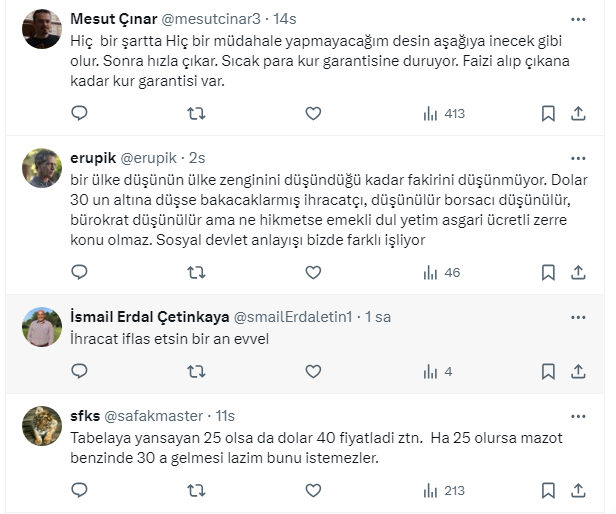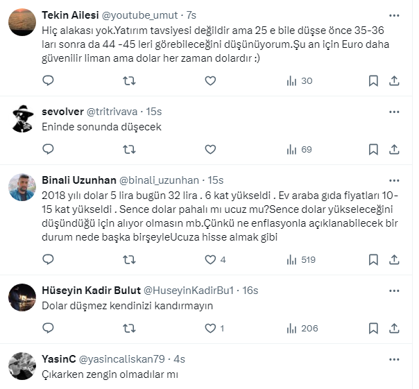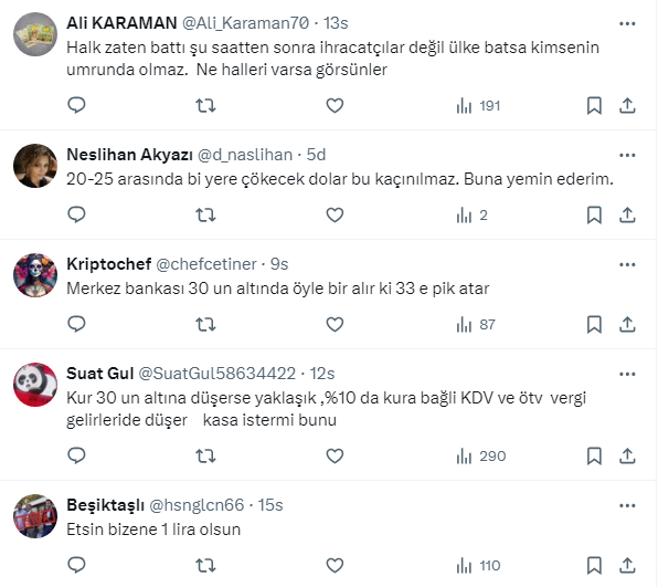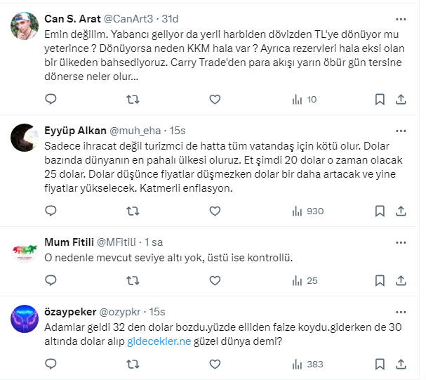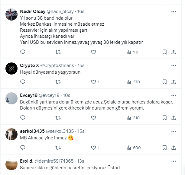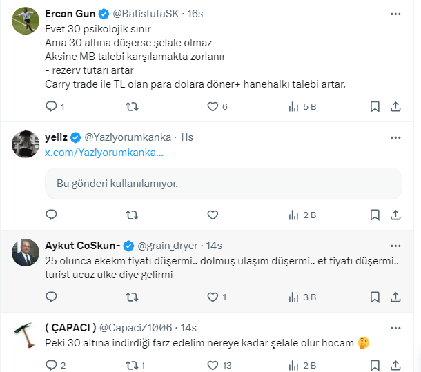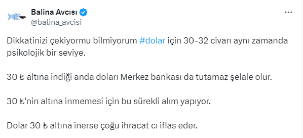 Döviz piyasasında bu gelişmeler yaşanırken, 294 bin takipçili Balina Avcısı, https://x.com/balina_avcisi X sosyal medya hesabından yaptığı paylaşımda 30-32 TL’nin dolar için psikolojik seviye olduğunu belirterek, 30 TY’nin altına indiğinde Merkez Bankası’nın da doları tutamayacağını ifade etti: “30 TL’nin altına indiği anda doları Merkez Bankası da tutamaz şelale olur. 30 TL’nin altına inmemesi için bu sürekli alım yapıyor. Dolar 30 TL’nin altına inerse çoğu ihracatcı iflas eder” dedi.