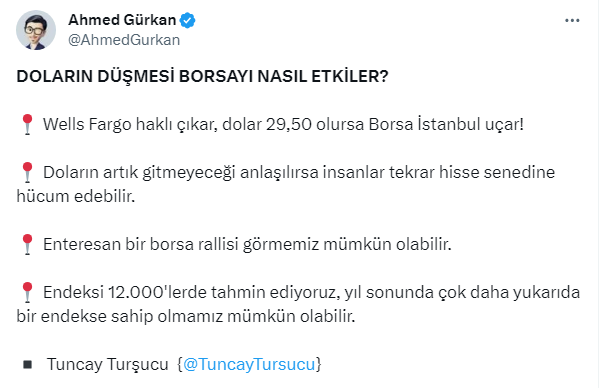 Ahmed Gürkan isimli X sosyal medya kullanıcısı https://twitter.com/AhmedGurkan, Borsa Analisti Tuncay Turşucu’nun Wells Fargo’nun tahmininin doğru çıkması halinde borsada olacaklarla ilgili söylediklerini paylaştı.