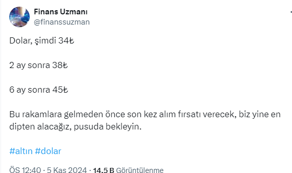 Finans Uzmanı sosyal medya hesabı X'ten dolar kuru ile ilgili değerlendirmelerde bulundu. Doların 2 ay sonra 38 lira ve 6 ay sonra 45 lira olacağını söyleyen Finans uzmanı son bir alım fırsatının olacağını söyleyerek 'pusuda bekleyin' diyerek yatırımcıları uyardı.