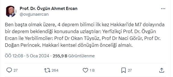 "Ben başta olmak üzere, 4 deprem bilimci ilk kez Hakkari'de M7 dolayında bir deprem beklendiği konusunda uzlaştılar: Yerfizikçi Prof. Dr. Övgün Ercan ile Yerbilimciler: Prof Dr Okan Tüysüz, Prof Dr Naci Görür, Prof Dr. Doğan Perincek. Hakkari kentsel dönüşüm önceliği almalı."