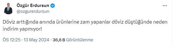 Dolardaki yükselişin durmasına rağmen ürünlere yeni zamlar gelmeye devam ediyor. Bu duruma dikkat çeken, Sosyal Güvenlik Uzmanı Özgür Erdursun, https://twitter.com/ozgurerdursun resmi X sosyal medya hesabından yaptığı paylaşımda, döviz arttığından anında zam yapanlar döviz düştüğünde neden yapmıyor, diye sordu.
